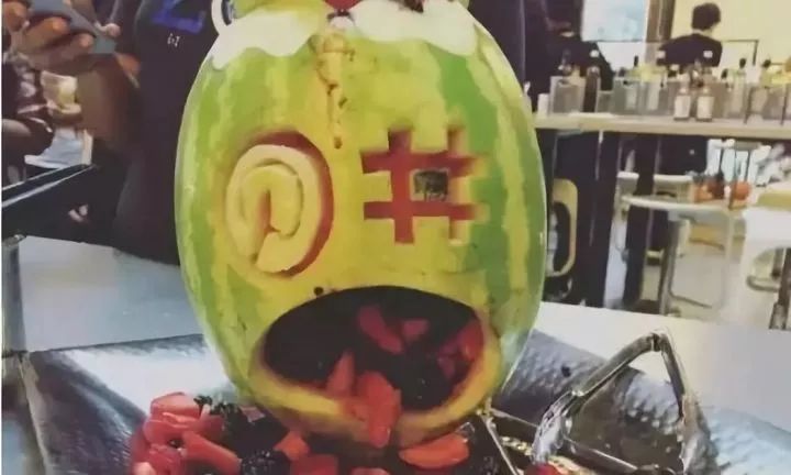 Pinterest 食堂师傅恶搞水果拼盘:呕吐的西瓜,雕刻上Pinterest的logo。非常有万圣节气氛了!