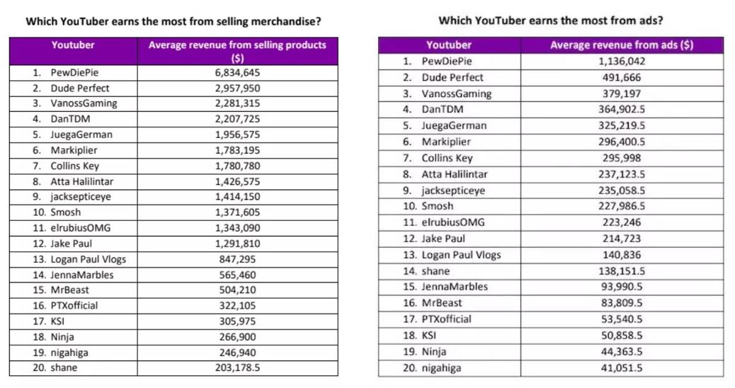 在PewDiePie 800万美元的月收入中,我们发现,卖货月收入达到了惊人的683.5万美元,广告月收入仅为13.6万美元,卖货贡献占到了85%。其他YouTuber们的广告月收入和卖货收入对比起来也同样的差距悬殊,几个头部YouTuber带货收入达广告收入的6倍。