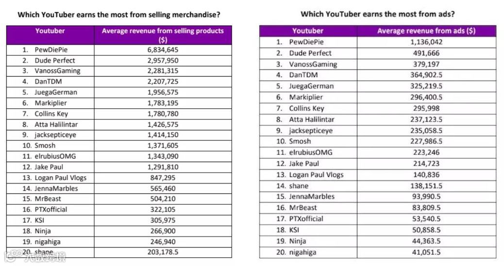 8月初,公关咨询行业权威媒体PRWeek曾引述过一份研究报告,该报告按照月收入给YouTube上的头部博主进行了排名。