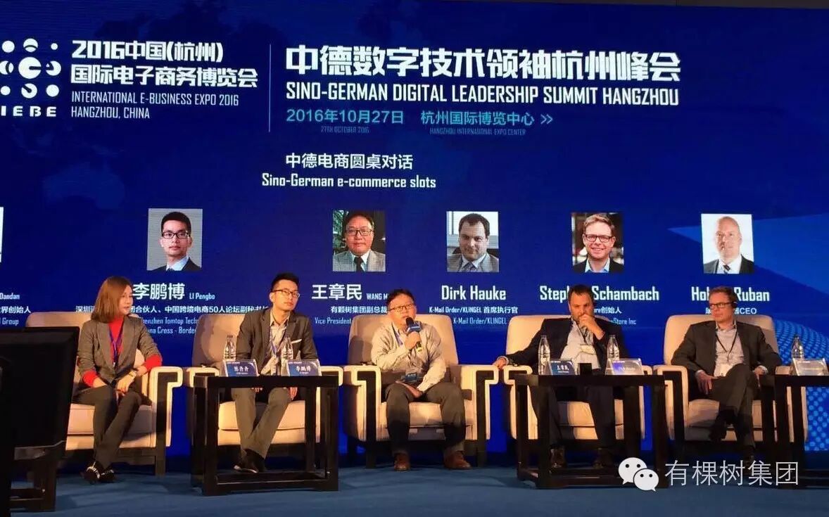 此外,有棵树集团副总裁王章民先生代表跨境电商企业参与了“中德数字技术领袖峰会”。会上,王章民先生代表中国企业界与德国邮政银行首席数字官飞利浦•劳克斯先生、德国Payback公司首席运营官多米尼克•多米克先生等业界知名人士围绕“中国和欧洲成功的电子支付模式及其影响”展开讨论。