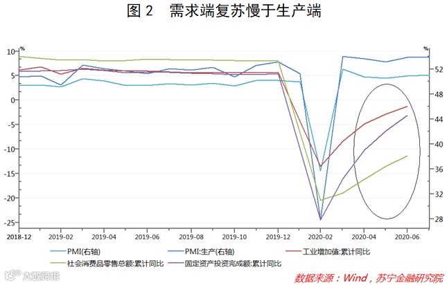 尽管今年二季度我国经济增速由负转正,工业增加值、工业企业利润增速等指标都在不断修复,但总体上看,需求端的复苏进程要明显慢于生产端(见图2),这也更加凸显出激活内需市场、“构建完整内需体系”的必要性。
