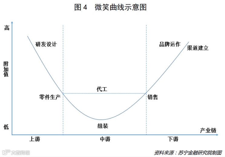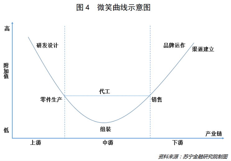 于我国而言,尽管近些年科技实力的进步有目共睹,但在全球价值链分工中,我国依然被限制在加工、组装等劳动密集型生产环节,这恰恰是位于微笑曲线最底部、利润率最低的地方(见图4);反观西方发达国家,他们凭借着对高精尖技术的掌控,牢牢地把握住研发设计、品牌营销等位于微笑曲线两端附加值较高的环节,往往能在掌握话语权的同时,获取高昂的利润。此外,在芯片、半导体、工业软件、航空发动机等核心技术领域,我国依然面临着被“卡脖子”的情况,这便容易让我们在关键时刻处于被动局面。
