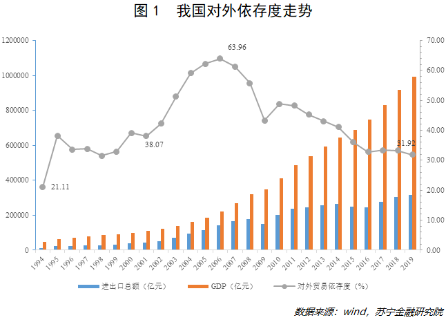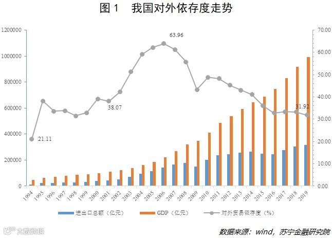 在此前的“外向型经济”思路下,我国经济一直都与海外市场深度绑定,这从外贸依存度(进出口总额/名义GDP)中可以得到反映:1995年至今,我国对外依存度从来没有低于过30%,尤其是2001年加入WTO后,该指标数值迅速攀升,最高曾达到63.96%(见图1),这也在很大程度上让我国经济频频受到全球经济波动和贸易摩擦的影响。