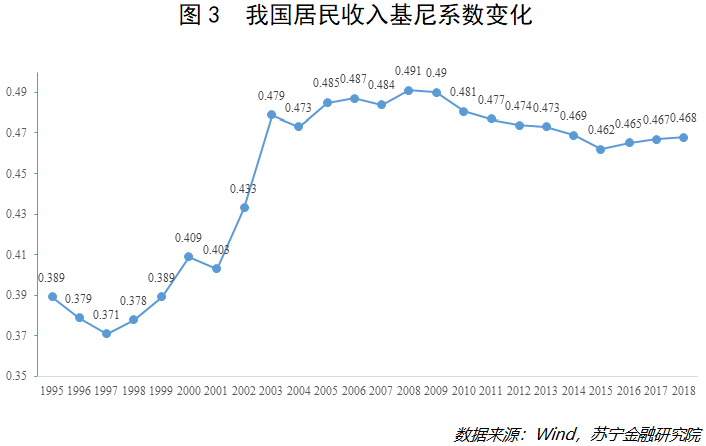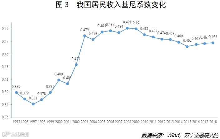 从基尼系数上看,自2000年首次超过警戒线0.4开始,便几乎没有停下升高的步伐, 2018年达到0.468(见图3),反映出我国居民收入差距日益拉大,而绝大多数人的收入水平仍属于偏低状况,总理所说的“6亿人月收入只有1000元”就是佐证。按照经济学理论,高收入者的边际消费倾向低于中低收入者,收入差距扩大将不可避免地制约消费扩张与升级。