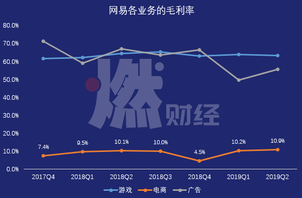 根据财报,从2017年Q4至2019年Q2的7个季度中,网易游戏的平均毛利率为63%,广告为62%,而电商只有9%。其中,电商在2018年Q4创下季度最低值,毛利率只有4.5%。而这还只是毛利率,如果扣除各项经营费用和配送成本,网易电商基本无钱可赚。