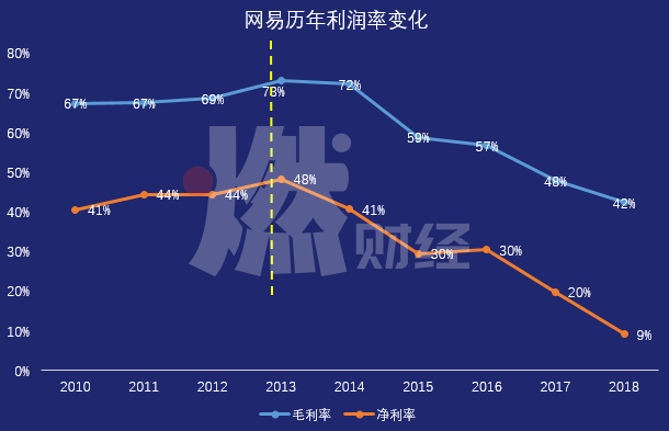 从2010年到2013年,网易的毛利率均值为69%,2013年达到顶峰73%;净利率的均值为44%,2013年达到顶峰48%。而且,这两项指标都在逐年提升。但是2014年网易大力投入做电商后,网易整体的利润率逐年下降,毛利率从2014年的72%降至2018年的42%,净利率从41%降至9%。