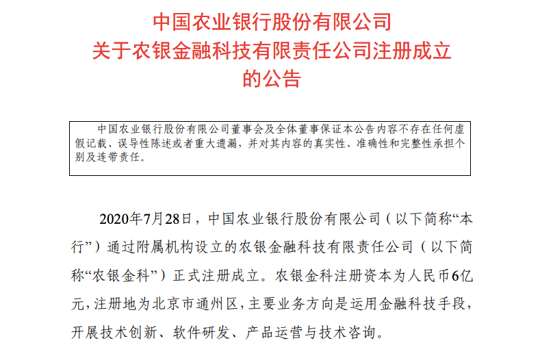 7月28日,农业银行公告称,2020年7月28日,中国农业银行股份有限公司(以下简称“农行”)通过附属机构设立的农银金融科技有限责任公司(以下简称“农银金科”)正式注册成立。农银金科注册资本为人民币6亿元,注册地为北京市通州区,主要业务方向是运用金融科技手段,开展技术创新、软件研发、产品运营与技术咨询。