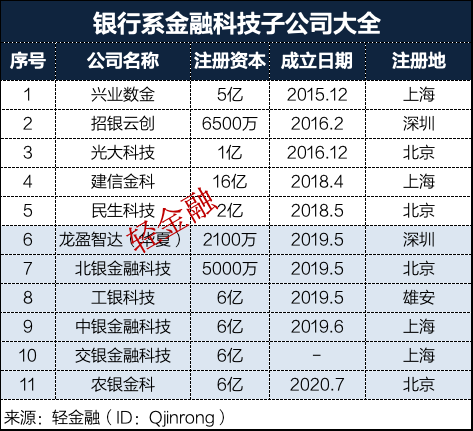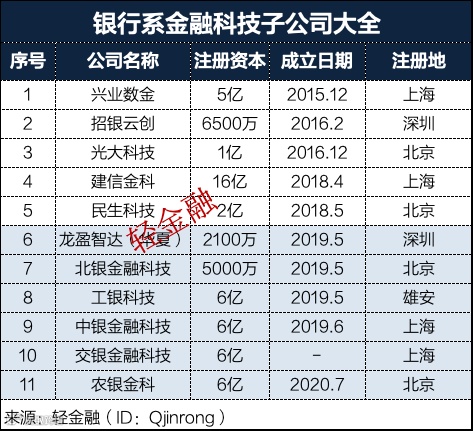 2019年,工行、中行相继成立了自己的金融科技子公司;2020年交行金融科技子公司开始设立,2020年7月,农银金科成立。