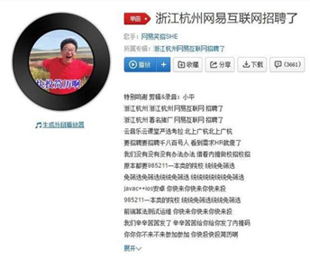 网易校招也是认真的,而且他们真的太会玩了。首先校招组叫“校招天团”,17 年的校招出炉了一首鬼畜神曲《浙江杭州网易互联网招聘了》,尽管这首歌看起来很像网友恶搞,但它的确是网易2017年校园招聘的"官方宣传"。