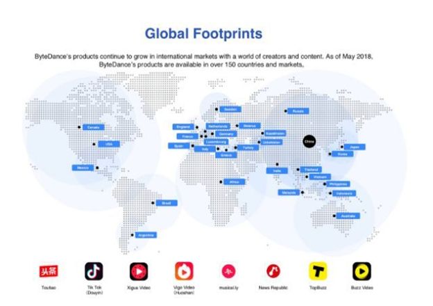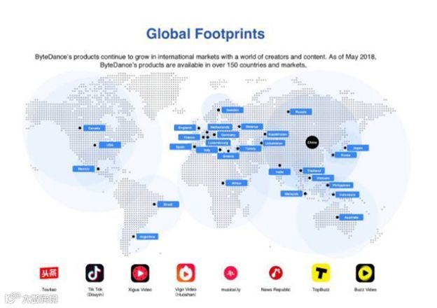 (截止 2018 年 5 月,字节跳动产品已经在超过 150 个国家和市场上线)