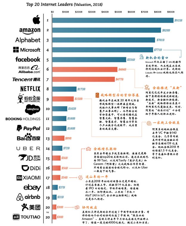 咱来看看 2018 年全球价值 Top20 的互联网公司中,几个在国内发展势头强劲的公司都在布局些啥吧!