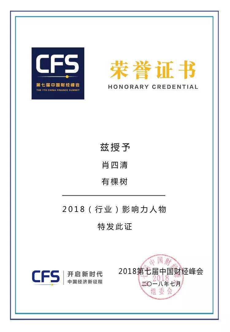 2018年7月19日-20日,第七届中国财经峰会在北京盛大举行。深圳市有棵树科技股份有限公司(以下简称“有棵树”)一举斩获两项大奖:有棵树荣膺“2018(行业)影响力品牌”,有棵树董事长肖四清先生荣膺“2018(行业)影响力人物”。