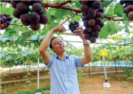 他积极参加葡萄生产技术创业培训,提升和巩固葡萄栽培和病虫害防治等关键性技术,更注重新品种引进和科技攻关。针对丁庄村葡萄绝大多数是露地栽培,巨峰、夏黑等原有品种已逐渐失去优势的现状,在句容市农业农村局的支持下,方应明带领丁庄老方葡萄合作社社员主动与镇江农科院对接,搭建合作平台,实现科研成果就地转化。