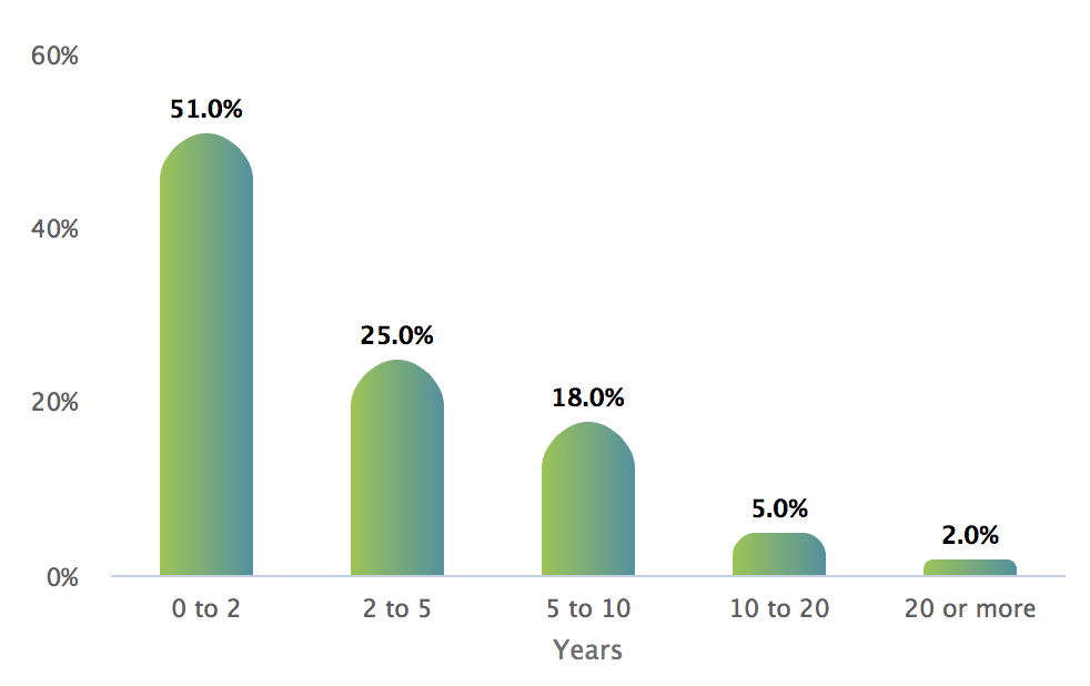 除了这5家公司,更令人惊讶的是Data scientist 从业者的工作年限。在Paysa的研究中, 5%的员工拥有10到20年的经验, 2%有20年或更多年的经验,18%的人有5到10年的经验,25%有2至5年的经验,而更多的是有0到2年的经验的数据科学家,占了51%。