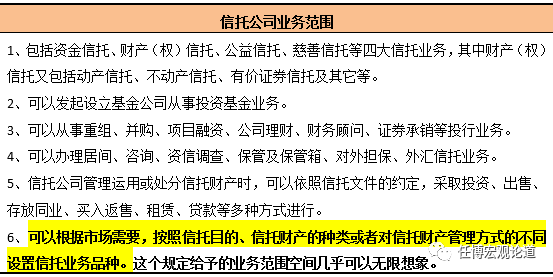 (2)当然和之前相比,目前的监管政策更关注信托公司在资本和风险方面的情况。同时信托公司的“双评级”模式也正在对信托公司的业务范围进行约束(银监部门与信托业协会均进行评级),特别是银保监会的《信托公司监管评级办法》中对信托公司在创新类、发展类和成长类层面的划分,已经对信托公司形成明显的引导效应。其中创新类信托公司(差不多10家左右)可以从事前文所述的所有业务和优先试点创新业务(目前仅有平安信托、中信信托、中融信托、华能信托、上海信托、中航信托、重庆信托、外贸信托及交银信托),发展类信公司则可以开展企业年金基金管理、特定目的信托机构、受托境外理财、股指期货交易、设立专业子公司等业务,成长类信托公司将严格受限。