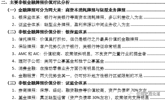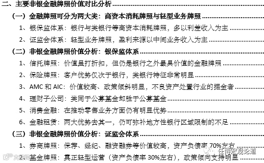 具体包括券商、基金、期货等牌照。所谓轻型业务牌照是指客户和项目几乎均来源于第三方,如券商、基金的客户和项目几乎均来源于商业银行,而这些非银机构从事的大多为轻型业务,且盈利方式主要以管理费等中间业务收入为主。