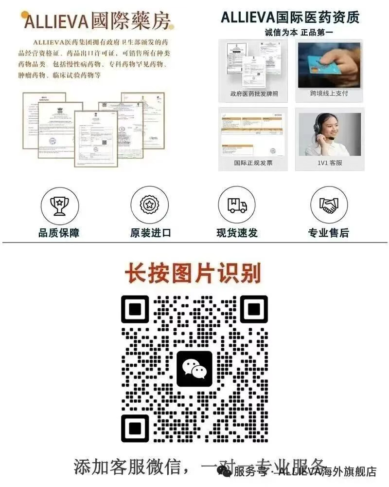 ALLIEVA医药集团是经卫生部批准的全球性医药服务商,具备全品类药品进出口经营资质。集团构建了符合国际药品流通标准的现代化供应链体系,专业提供处方药、罕见病药物、抗肿瘤药品等全分类医药产品,并通过香港前置仓实现高效跨境物流,致力于为患者提供安全、可靠、及时的医药保障。