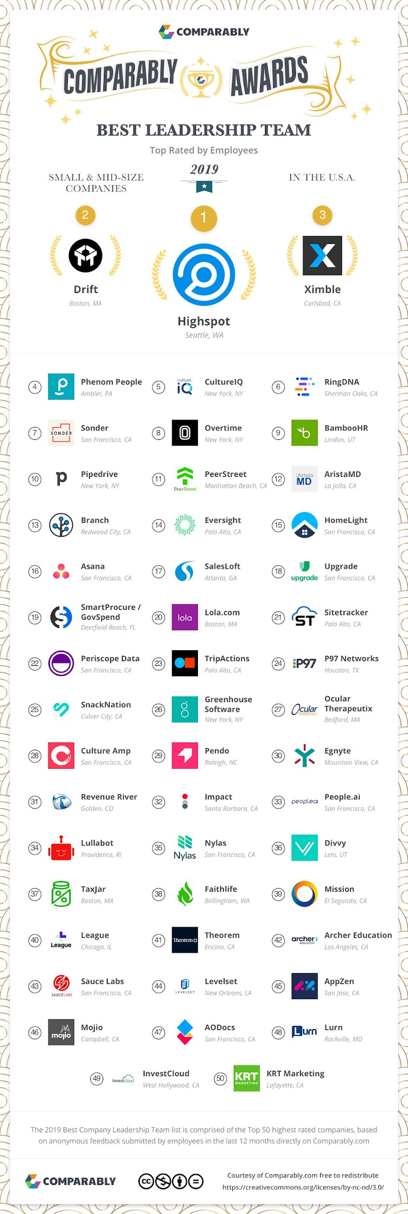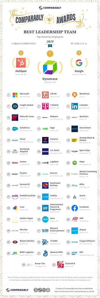 Comparably评出的2019年度最佳领导力公司已经新鲜出炉了!总共有两个排行榜,包括了前50名的最佳企业,一个是超过500人的大公司,另一个是总人数少于500人的中小型企业。力压Google的是Dynatrace和HubSpot. 入榜单的还有我们熟悉的Microsoft、LinkedIn、Facebook、 Salesforce 等科技公司。