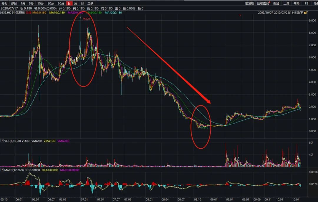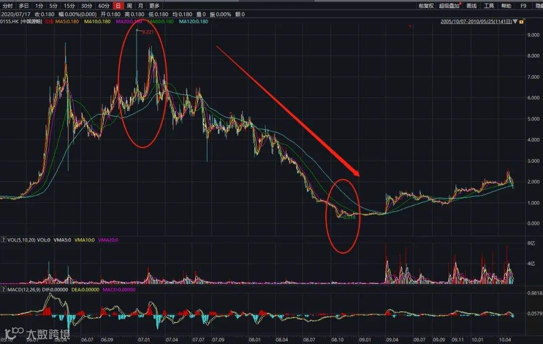具体来看这只股票的行情图,可以发现在2006年12月28日开盘价为9.221港元的高位,而在2008年10月27日收盘价仅为0.310港元,这一区间的跌幅也达到了96.64%。
