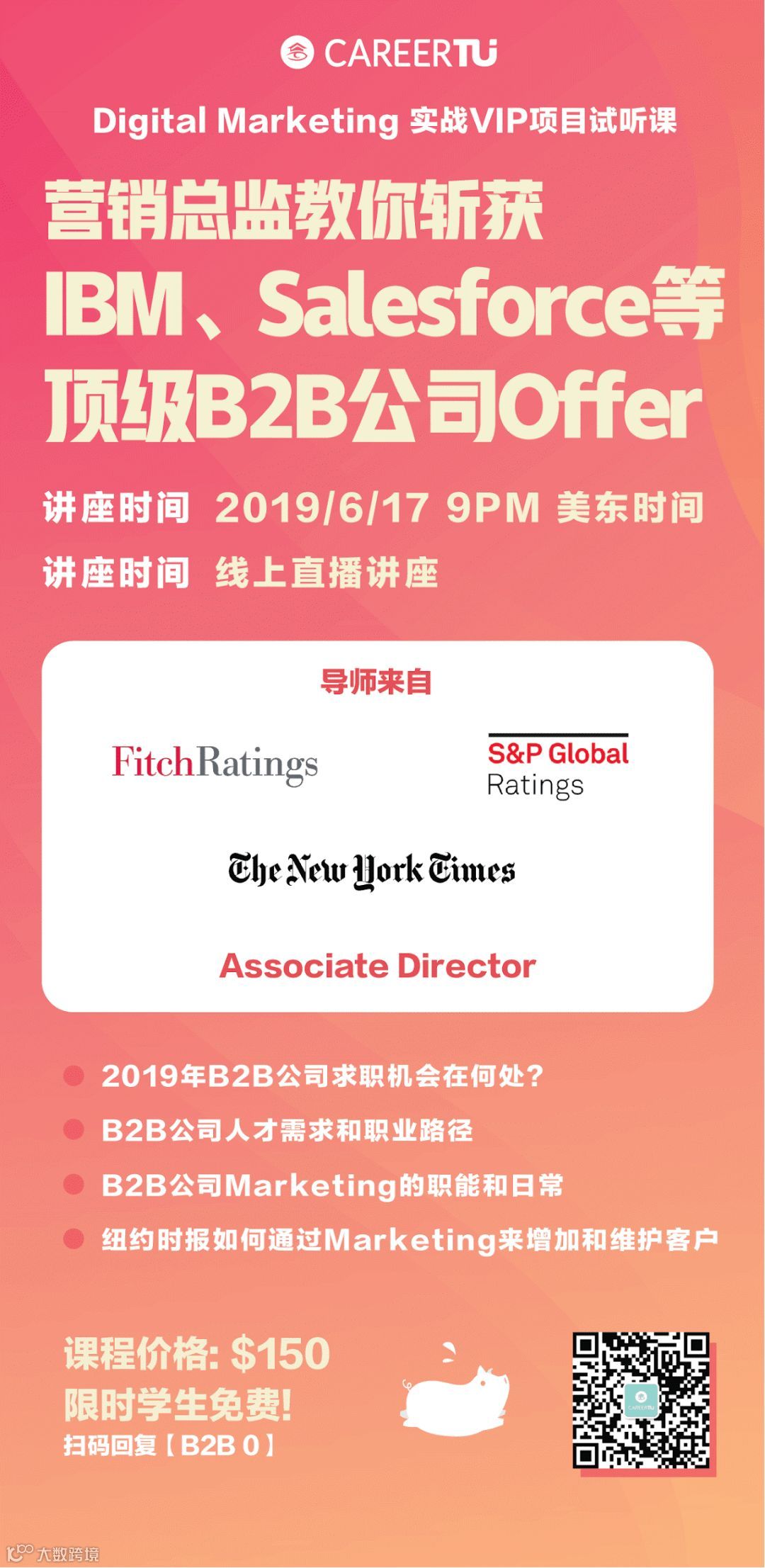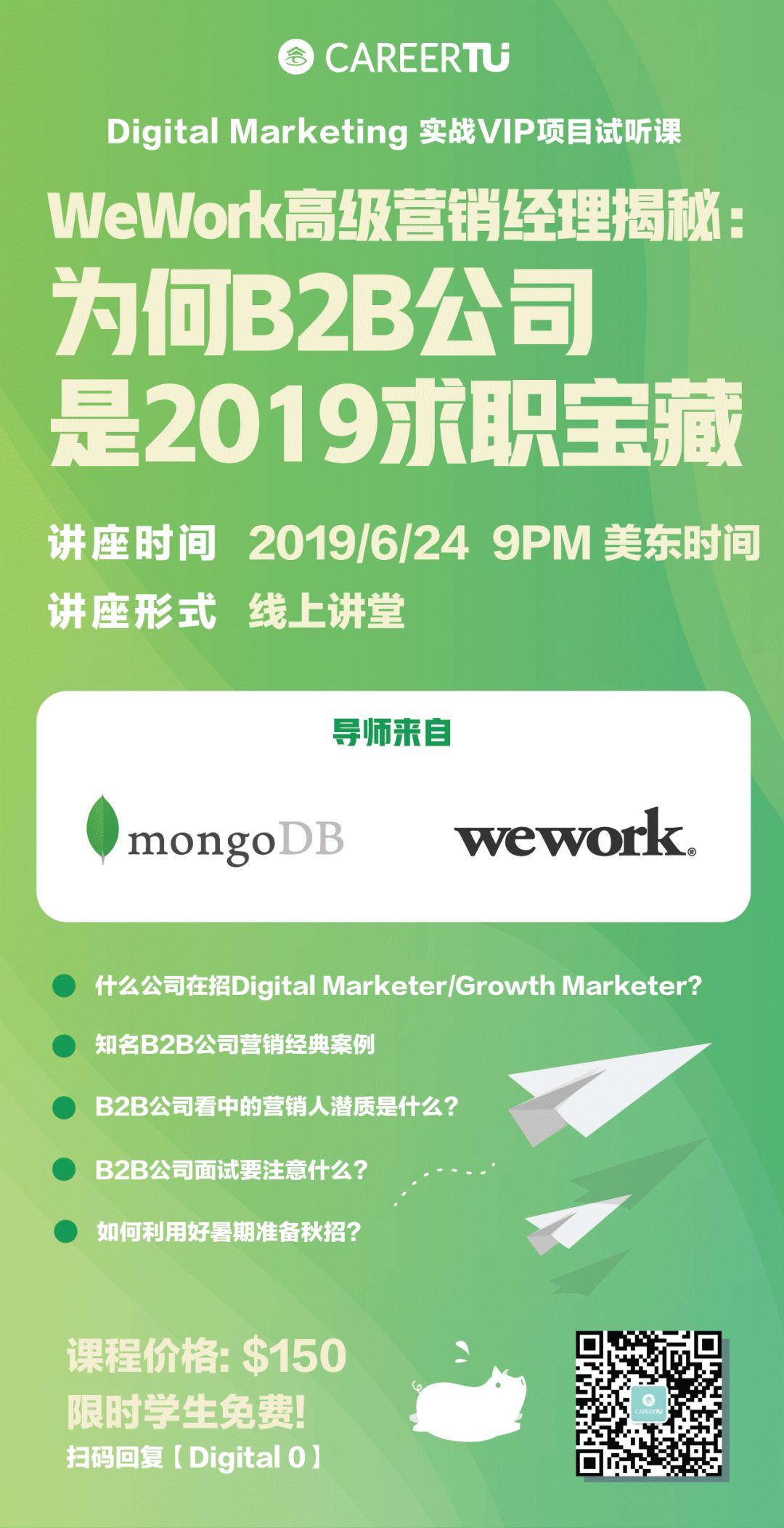 来自共享工作空间WeWork的资深Digital Marketer,拥有7年+B2B数字营销经历,将带你学习掌握B2B公司营销精髓,以及求职必备知识和技能。