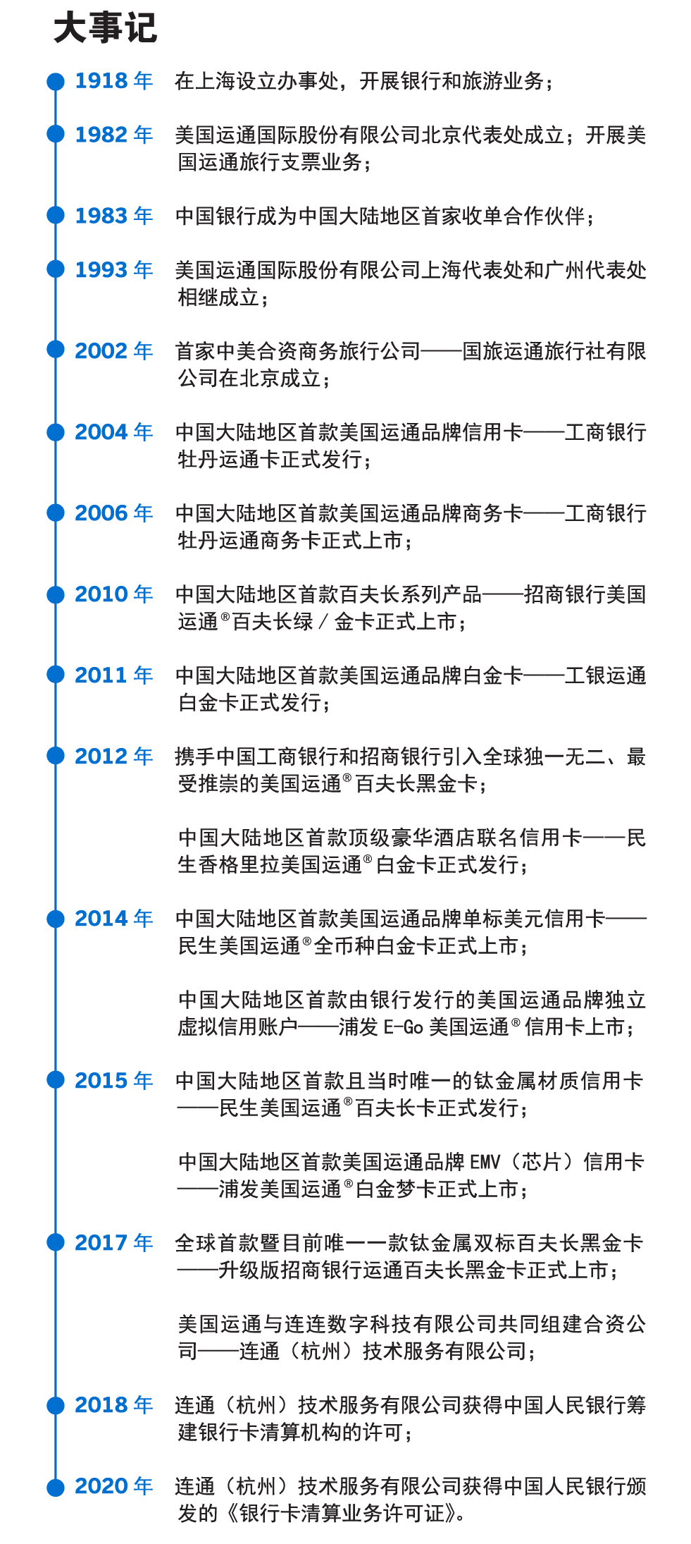 美国运通与中国市场的渊源最早可以追溯到1916年的香港。1918年,美国运通来到上海,是最早在中国大陆市场服务全球客户的公司之一。今天,美国运通在中国大陆市场有两大主营业务——信用卡服务和旅游服务。