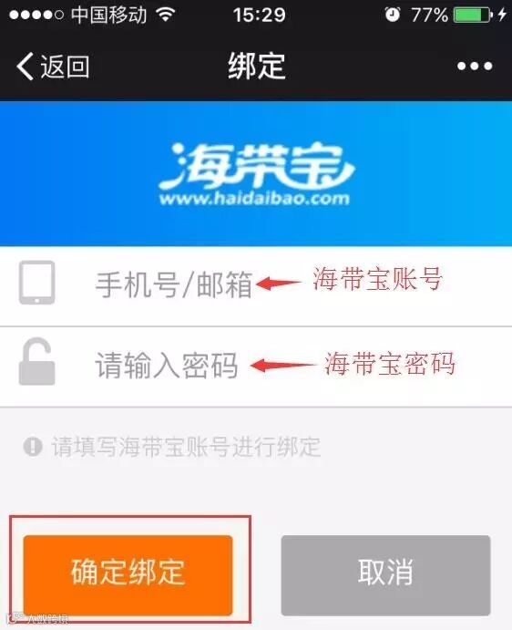 点击“我的账户”-“绑定/解绑”,输入海带宝账号及密码,确定绑定