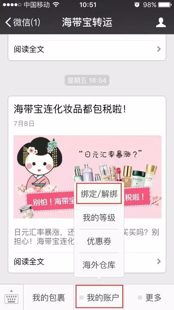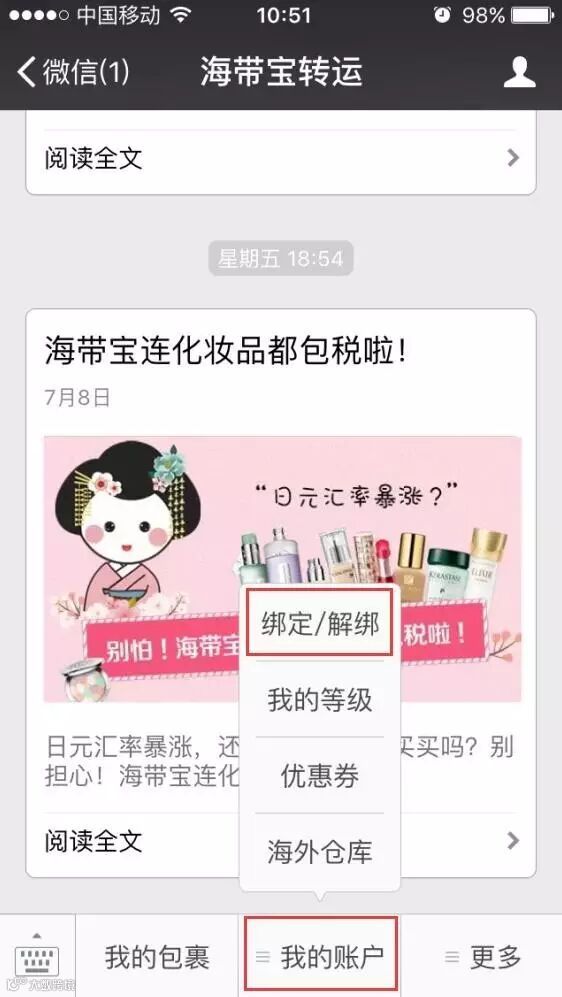 关注全新公众号“海带宝转运”并绑定海带宝账号即可获得1000海带币!