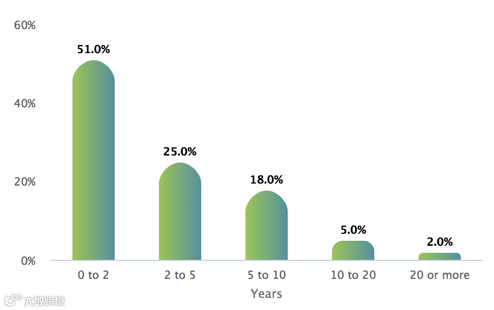 除了这5家公司,更令人惊讶的是Data Scientist 从业者的工作年限。在Paysa的研究中, 5%的员工拥有10到20年的经验, 2%有20年或更多年的经验,18%的人有5到10年的经验,25%有2至5年的经验,而更多的是有0到2年的经验的数据科学家,占了51%。
