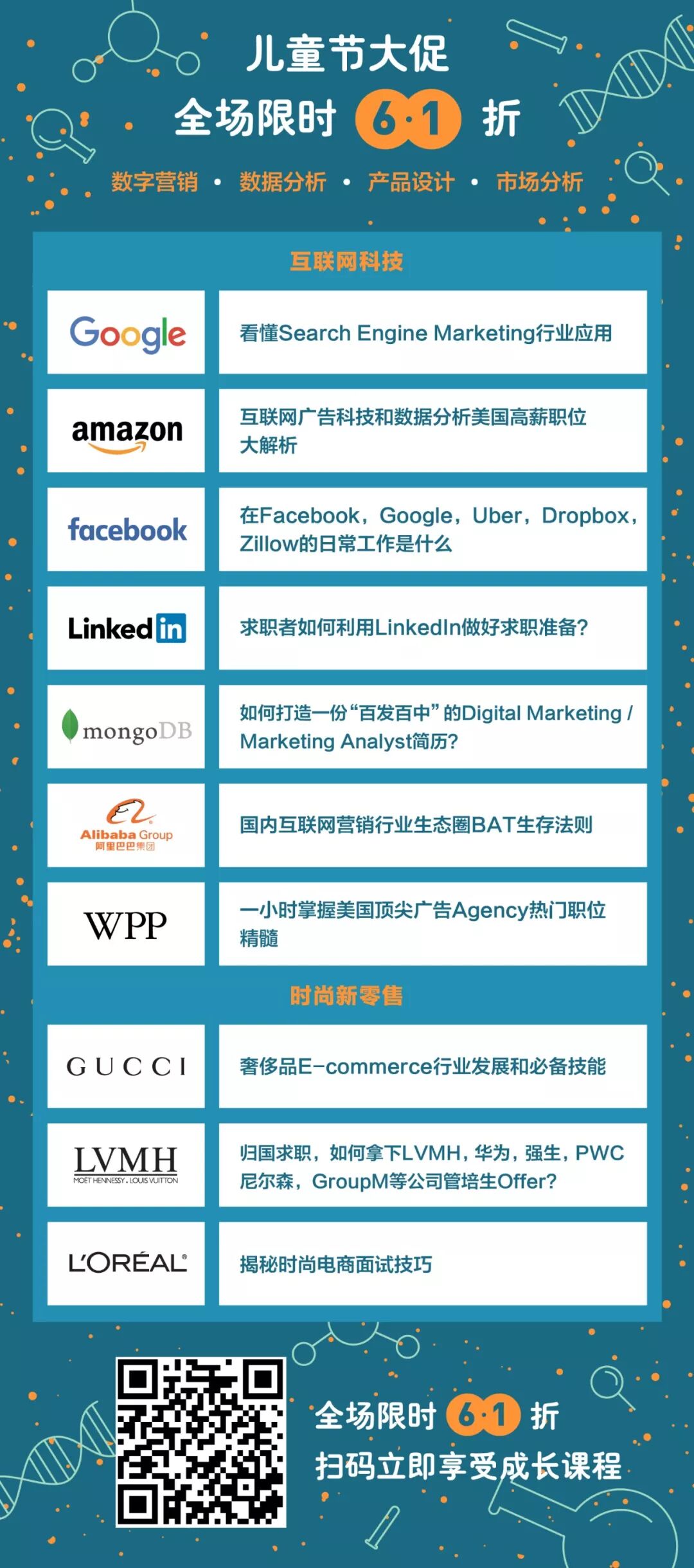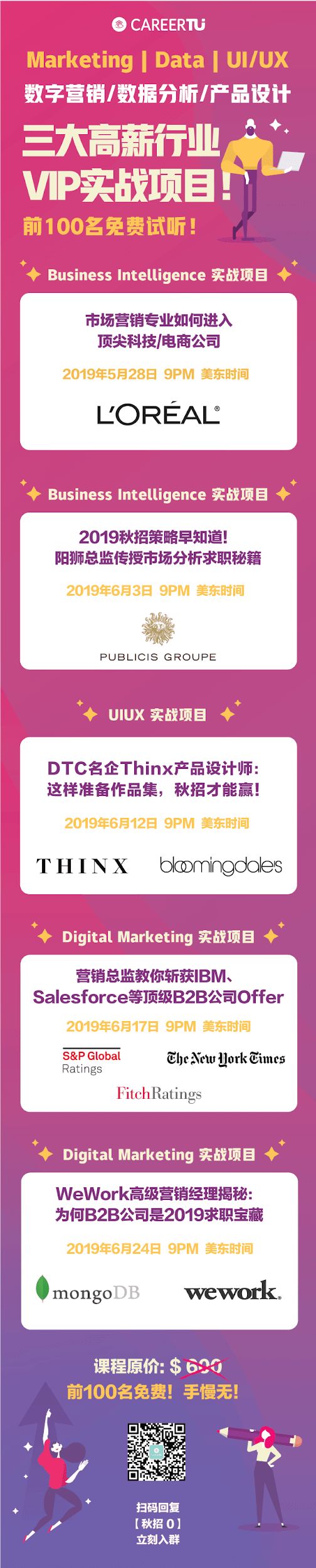 暑期是冲击秋招的最后备战期,也是自我提升的最佳时期。6月,职图最新推出系列线上试听课,涵盖Digital Marketing ,Marketing Analytics,Business Intelligence,UIUX等领域。快选择你最想听的课程,加职图学姐好友,报名参加吧!