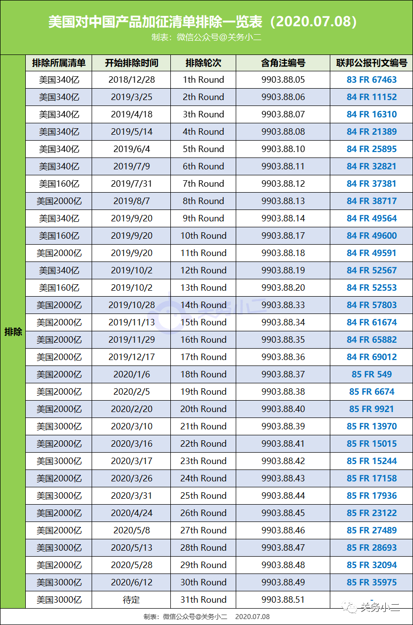 (美国对中国加征关税排除一览表)