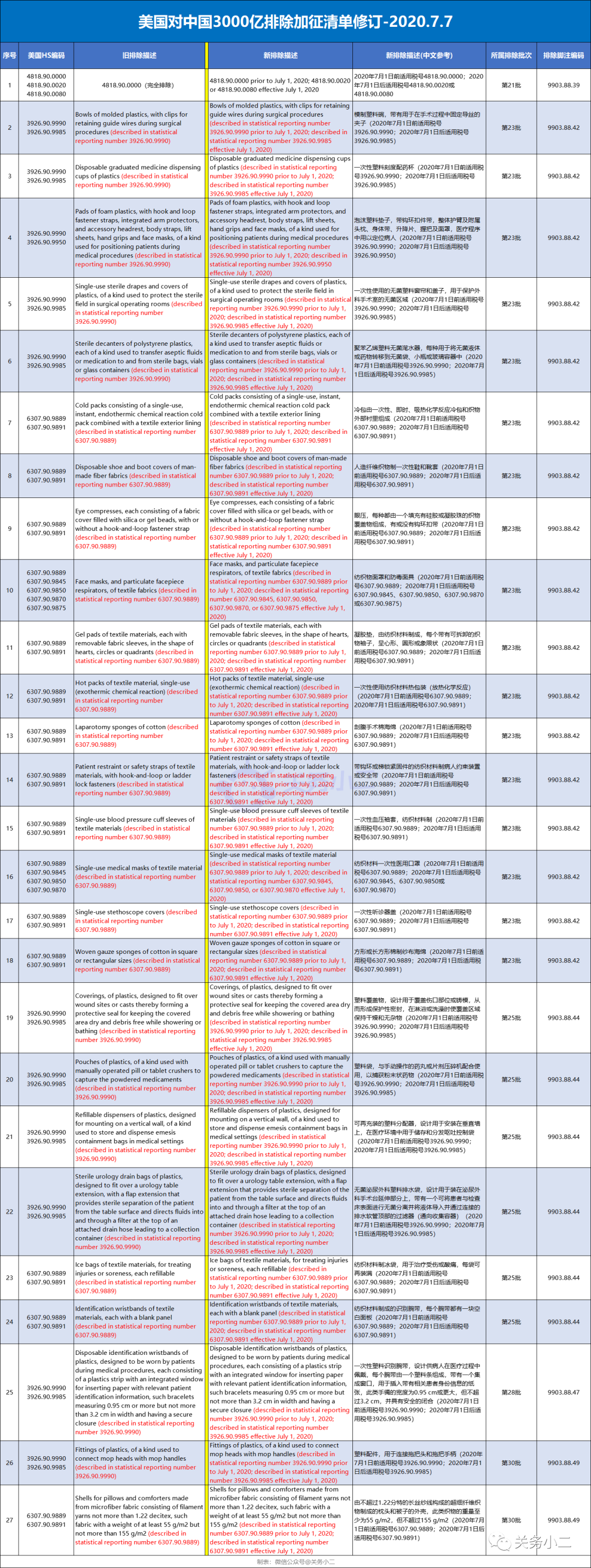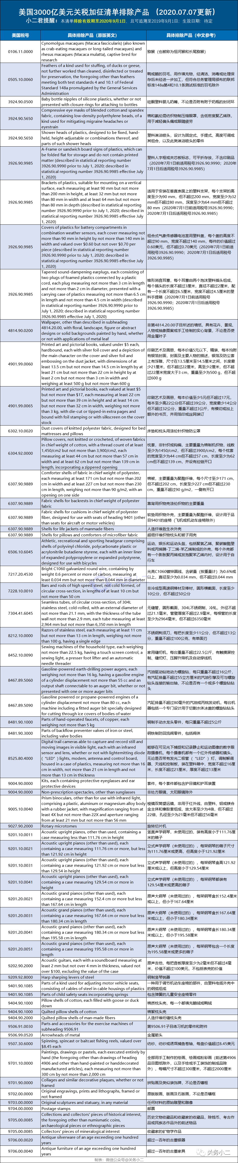2020年7月7日美国排除对华商品加征关税清单情况: