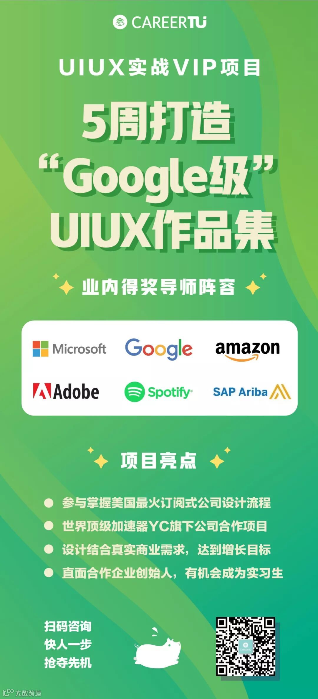 来自Amazon、Google、Adobe、ADP等名企资深UIUX Designer,用10节行业课程,让同学们掌握从用户实际需求到Prototype的建立、UX的设计到KPI的选择和追踪,产品设计需要经历的不同阶段与步骤,全方面了解Product Design的核心知识点。
