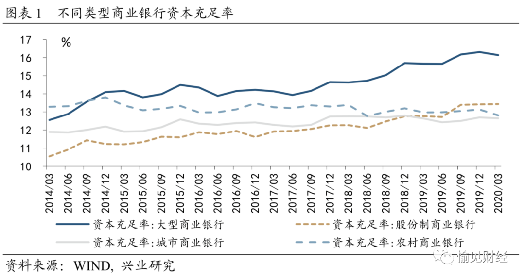 兴业研究的报告亦称,从近年来不同类型的银行资本充足水平来看,2014年以来,国有大行和股份制银行的资本充足率水平稳步提升,而城商行的资本充足率水平基本持平,农商行的资本充足率甚至略有下降。