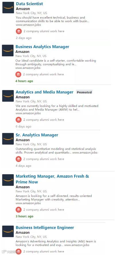 去年,Amazon宣布过将在纽约Hudson Yard办公室新招聘2000个职位, 其中不乏高薪职能,包含Digital Marketing, Marketing Analytics, Product Marketing,Data Science等领域,薪资平均数在10w+。