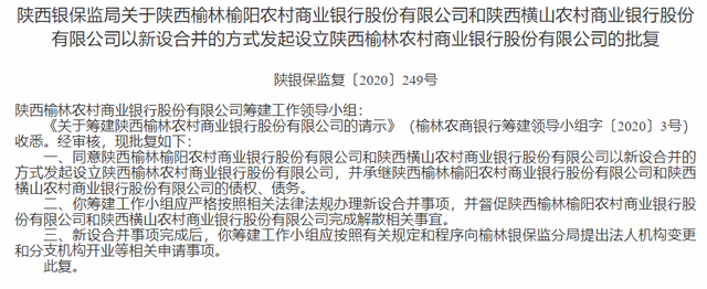 银保监会官网信息显示,近日,陕西银保监局已作出同意榆阳农商行和横山农商行以新设合并的方式发起设立陕西榆林农村商业银行,并承继其债权、债务的批复。