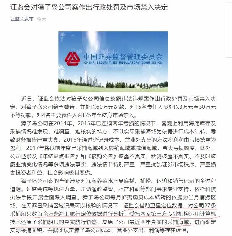 除了财务造假,证监会还通过定位数据查明獐子岛“秋测”存在虚假记载。