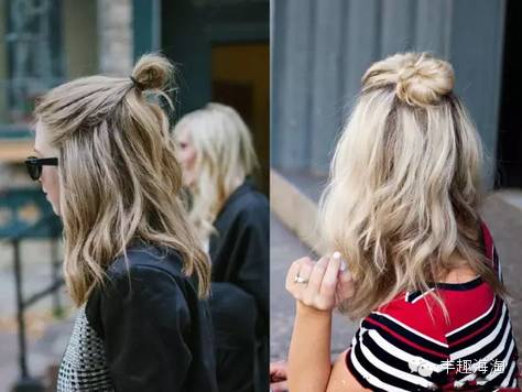 半丸头顾名思义,就是扎了一半的头发扎成丸子,一半的头发散开。