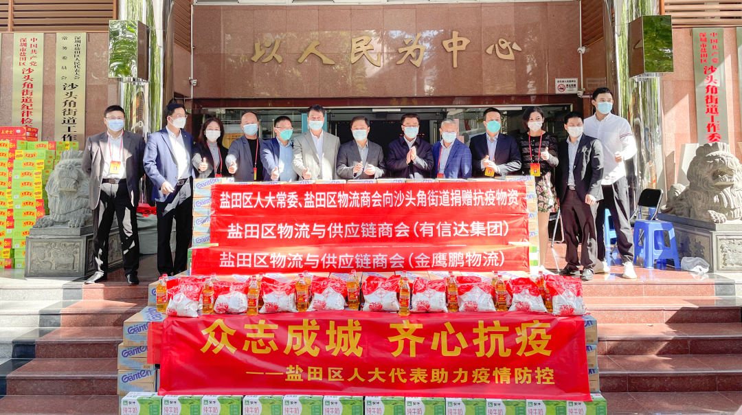 为缓解受疫情影响的封控社区生活不便,在盐田区人大乔主任、周敏主任等人大代表的号召下,盐田区物流与供应链商会积极响应,陈小斌会长发起抗疫捐赠活动,盐田区人大常委、盐田区物流与供应链商会、有信达集团、深圳市金鹰鹏物流有限公司、盐田国际集装箱码头及深圳市立航货运股份有限公司等企业单位,为沙头角山海华庭封控区五百户居民捐赠共计15万元,购买油、米、水、牛奶等生活急需用品,分批分次给与沙头角街道办分发到社区,并于3月8日顺利举行“集中捐赠仪式”。