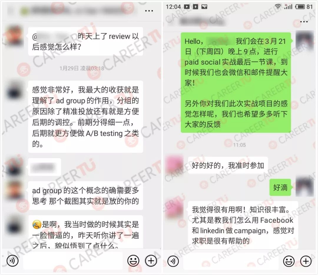 毕业后将有机会加入职图精英校友群,与中美6000+导师及校友共同进步。线上将会发送行业干货,分享最新职位需求,与同、往期校友互相学习及分享。除此之外,还能参加职图定期举办的线下活动、可与同学及导师面对面沟通,快速拓展人脉圈,获取更多业界资讯!