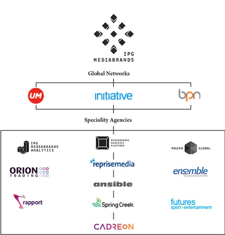 其中IPG Mediabrands集团是IPG的数据管理和媒体购买部门。下属子公司有:Cadreon,IDMedia,Initiative,IPG Media Lab。