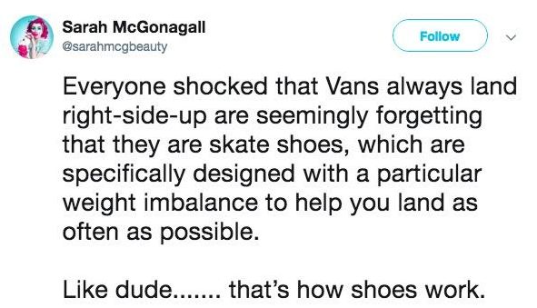 那,Vans为什么能总是稳稳地鞋底朝下落地?