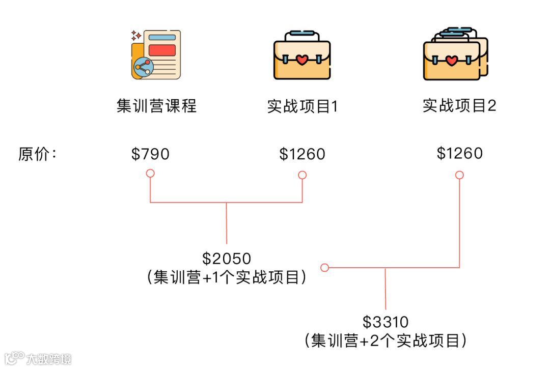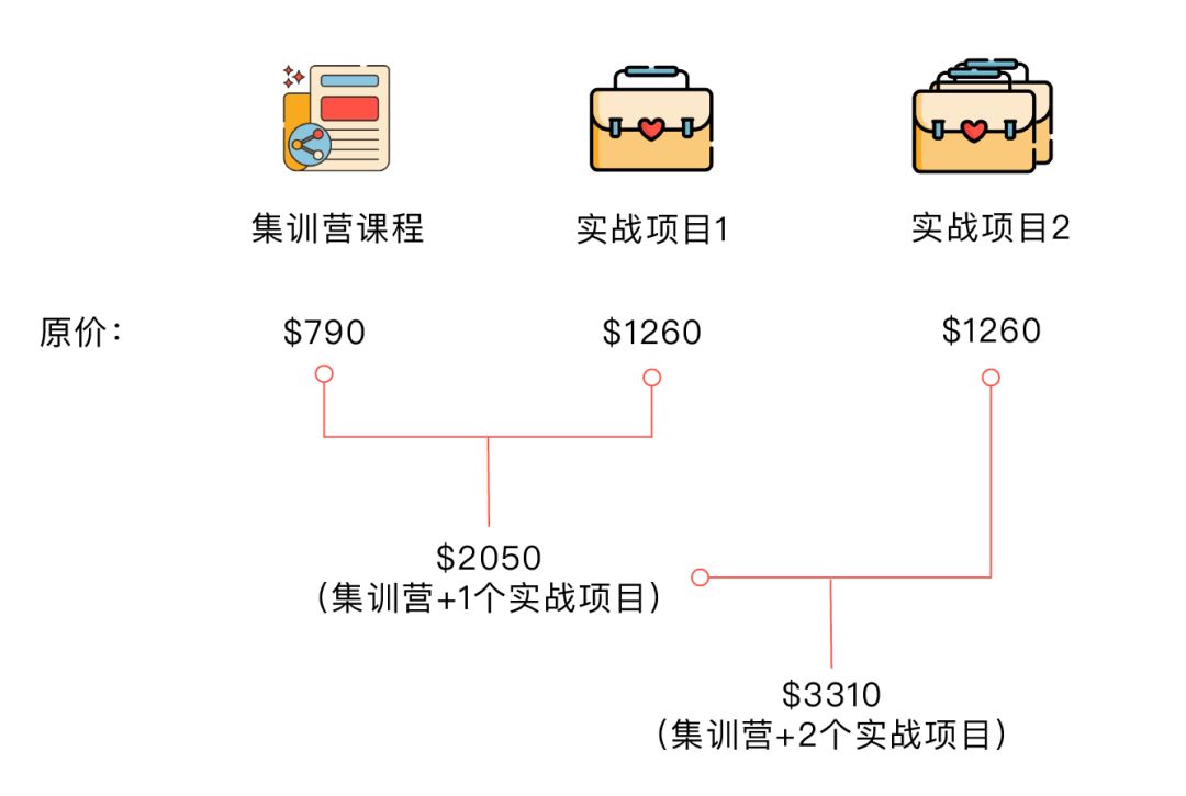 集训营课程加上一个实战项目,将享受近8折优惠;集训营课程加上两个实战项目,将享受近7折的优惠。