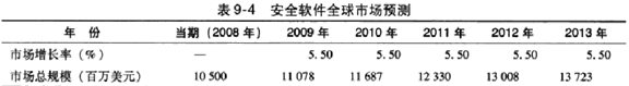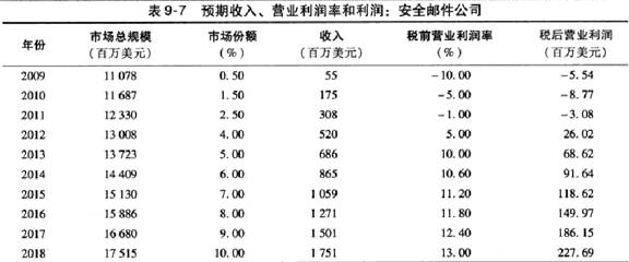 1) 市场总规模。安全邮件公司计划出售反病毒软件。我们采用安全软件(包括反病毒软件)的全球市场总规模的评估值—来自高德纳公司2008年数据。表9-4概述了这个市场规模2008年的评估值和2009- 2012年的预测值。