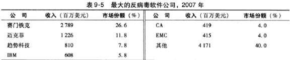 2) 市场份额。为了评估市场份额,我们看看在2008年这个市场上最大的几家反病毒软件公司(就市场份额而言)。表9-5(也来自高德纳公司)列示了最大的几家公司及其市场份额。
