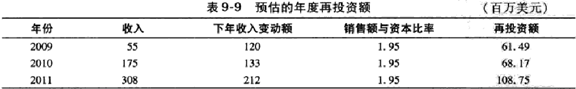5) 再投资。我们假设随着安全邮件公司在这个不断增长的市场上拓展其市场份额,其收入在第十年增加到了17. 5亿美元。为了评估安全邮件公司需要再投资多少资金,才能创造出这笔收入。我们采用了这个行业里的收入与已投资本比率1. 95(基于这项业务上市公司的收入和股权面值比) 。我们还采用了再投资和增长之间一年的滞后期。用来评估每年所需的再投资额。表9-9概述了我们的评估值。