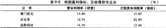 3) 营业利润/利润率。为了评估十年后的预期营业利润率,我们仔细了解了在2007年几家主要经营反病毒业务的最大上市公司的税前营业利润率和已投资本的税后回报率(见表9-6)。