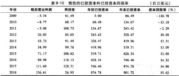 6) 核实内在的一致性。作为对我们评估值的最后核查,我们计算每年的已投资本,从500万美元的原始资本投资开始,把每年追加的投资额加到这个金额上,得到每个时期末累计的已投资本额。再用每年的税后利润除以这个累计的已投资本额,就得到了税后资本回报率(见表9-10)