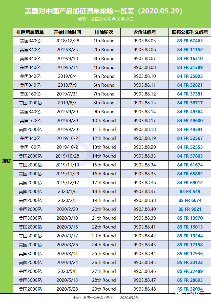 2020年5月28日美国对340亿关税排除有效期延长情况: