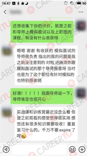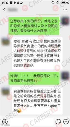 学员表示在模拟面试时,导师指出了许多她从未注意到的问题,帮助她更加全面地准备面试。同时,实战和集训营的课程也非常实用,表示要反复观看吸收!