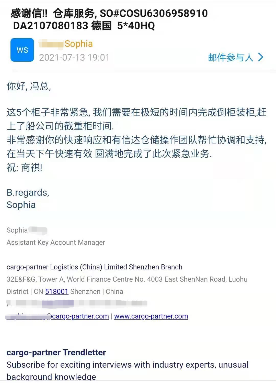 7月13日,有信达跨境1号仓小伙伴接收到:欧展国际货运(cargo-partner)有5个柜子需要倒柜装柜并需要迅速赶往船公司载重柜。小伙伴们立马响应!在专业团队的操作下,为客户优先协调作业,顺利处理紧急事件。有信达小伙伴们有着丰富的操作经验和高度的责任心,紧急事件处理so easy,合作伙伴和客户们再也不用担心紧急事件耽误进度了!